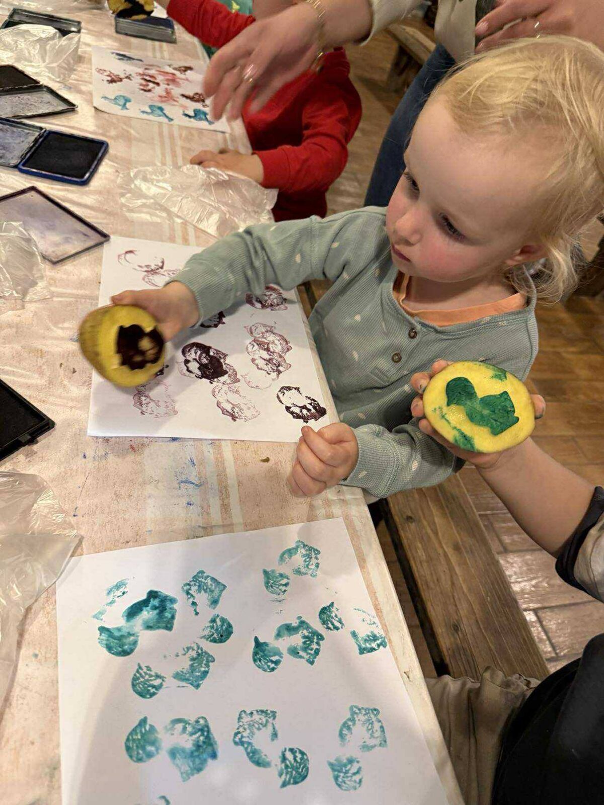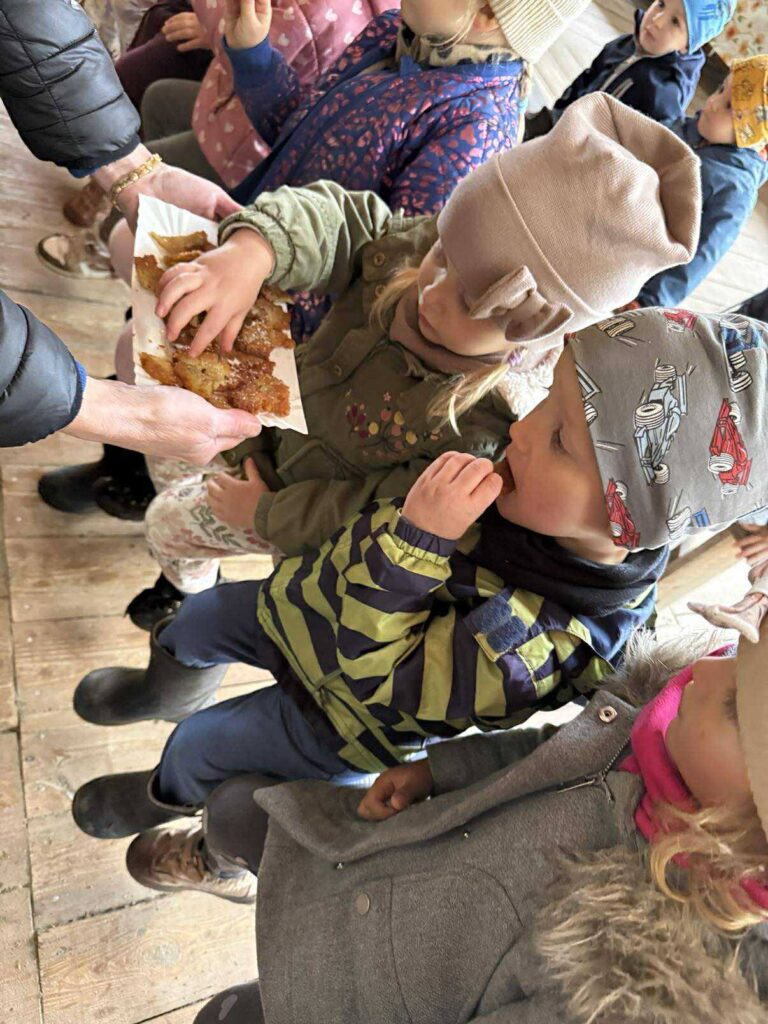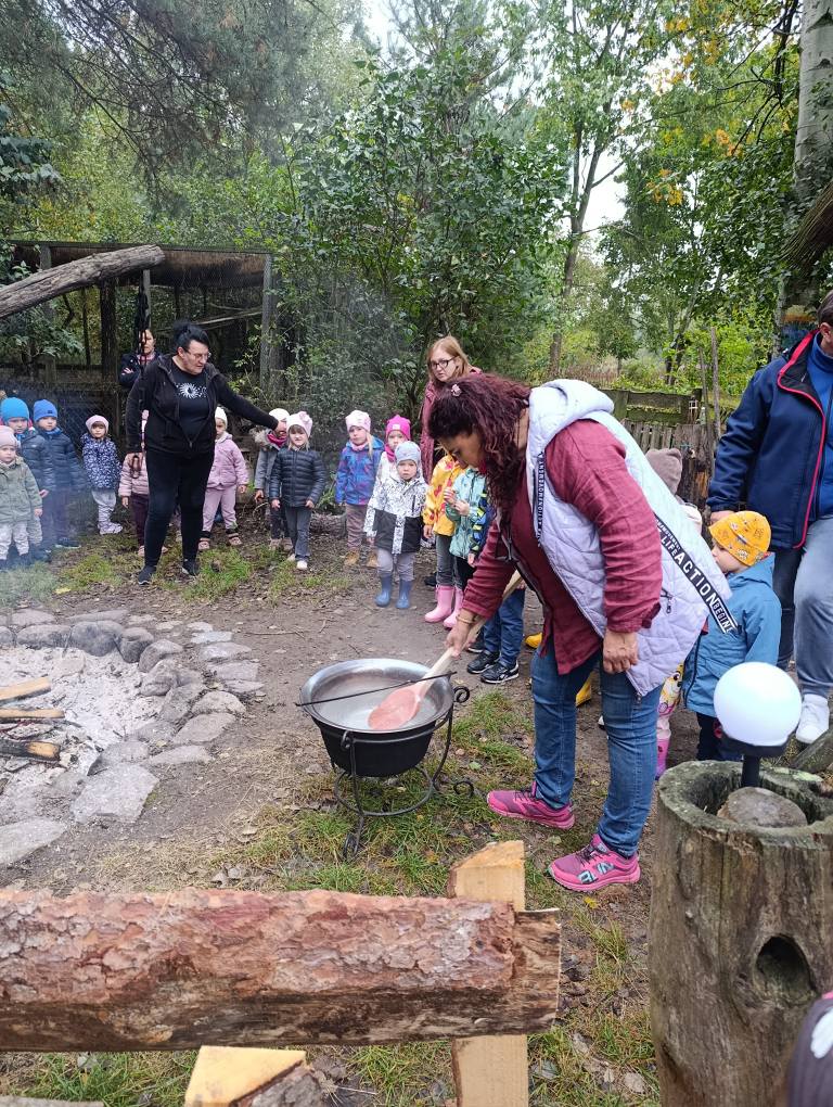 na warsztatach edukacyjnych „Dzień ziemniaka”. Pobyt rozpoczęliśmy od zabawy dramowej, dzięki której poznaliśmy historię uprawy ziemniaka. Pomogliśmy przygotować placki, a nawet deser z ziemniaków