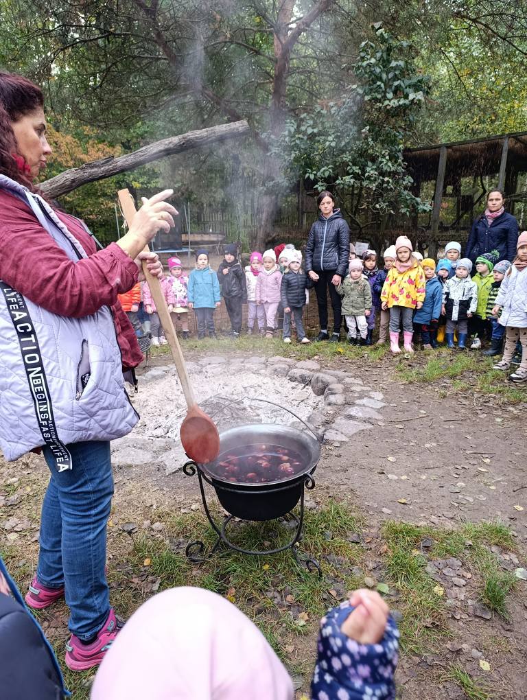 Na koniec zrobiliśmy ziemniaczane stemple i oczywiście zjedliśmy gorącą kiełbaskę z ogniska oraz próbowaliśmy pieczonych ziemniaczków oraz placków ziemniaczanych, a na deser zjedliśmy pyszny kisiel, który sami zrobiliśmy
